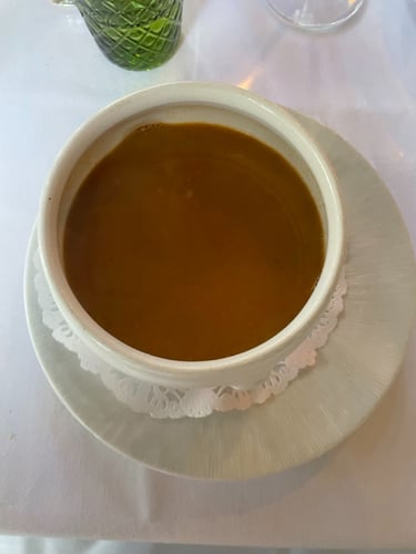 A timbale of extremely tender meat dressed with some greenery, and decorated with poached potatoes and fresh tomato. It was deceivingly substantial in size. The fish soup (with no actual fish) with roux and toasts was flavourful and rich and a nod to Marseille’s place as the home of bouillabaisse. We languished over both meals, they were delicious. A glass of wine accompanied. Having neglected to consult the wine list my efficient and helpful waiter offered the choice between two wines (for someone who often suffers from decision fatigue, this is exactly what I wanted), and I chose the Minuty, which was just the right mix of dry and Fruity. The steak arrived already sliced and divided between two plates with small dish of sauce and a piece of bone with the marrow on each. Expertly cooked at the textbook definition of ‘rare’ – not too bloody, but with the delicious sear on the outside. Good chips accompanied also.