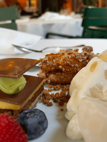 The service is typically French. This means to me, the people know what they are doing and how to do it, they don’t try to be your best friend but they are not rude at all, it’s courteous and respectful. There’s no bullsh*t. And so in that front it’s very relaxing to be in safe hands, without being ‘sloppy’. In for a penny in for a pound as they say so a shared main left room for dessert. With all the dessert choices looking equally good I went for a trifecta and ordered the Café Gourmand my companion had the ice cream. Three ‘boules’ of their choice being lemon vanilla and ‘pêche de vigne’’. My plate of three little delights did not fail to live up to expectations, a chocolate millefeuille, a croustillant chocolate noisettes, and a mochi a la Francaise was a good mix of sweet and less sweet to accompany my coffee. The Ice creams were curious, as the pêche tasted more like ‘fraise’.. after asking the question we were told the pêche was actually a ‘melange’ of pêche and fraise. …