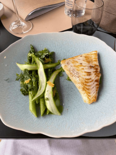 Just the right amount of time to make the meal a ‘working lunch’ passes and the main arrives. Exactly as described, grilled asparagus and fish. Under the fish, sliced discs of asparagus stem were hiding. All of it was perfectly seasoned. The fish was moist and fell apart with the fork. The asparagus cooked ‘al dente’, and while not sweet, the balance of the texture, the dressing, the hint of lemon made greens as pleasurable as dessert to eat. I also ordered a glass of white wine to accompany the meal. Having ignored the wine menu completely I am offered the house (Les Domaine de Fontenille) white, the first offering came across is somewhat buttery and with complete efficiency my waiter offered an alternative house wine (Cuvee Alphonse), with just a hint of more citrus without being tart.