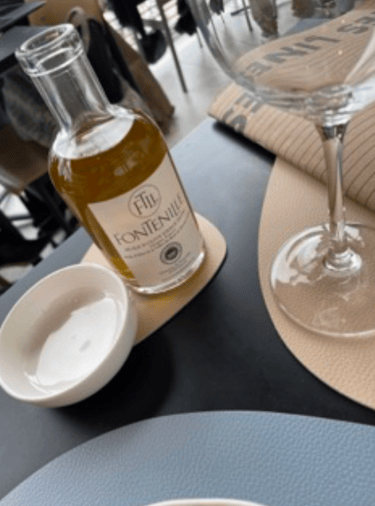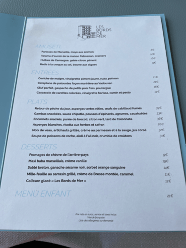 I am offered my choice of tables by a pleasantly friendly waiter. There are cloth napkins, leather placemats and coasters and chairs that are comfortable. I’m offered water ‘pétillante’ or ‘plate’ and then they bring a wine menu and the food menu: