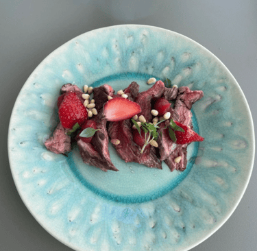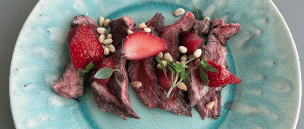 The tataki arrives quickly and it is absolutely what it say it is – beef with strawberry both whole and some puree, along with pine nuts and some herbs. The steak is cooked tataki style for sure, rare, cut thicker than a tartare, though it was tasty I did find I spent some time chewing. the strawberry and the steak are not a perfect match alone, the pine nuts cleverly build the bridge between the two. Intending to have a wine with the plat, I find the cocktail is generous enough for both meals. A next time might find me seated with the cocktail first or afterwards to enjoy the wine also.