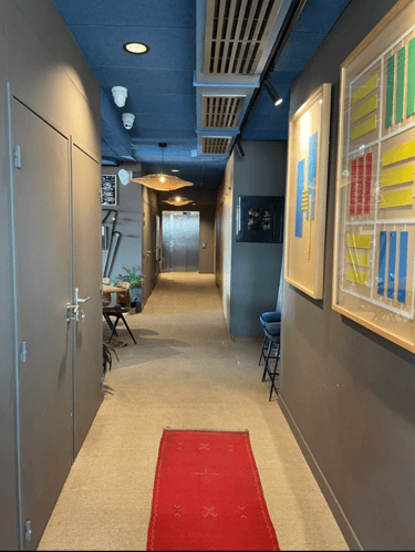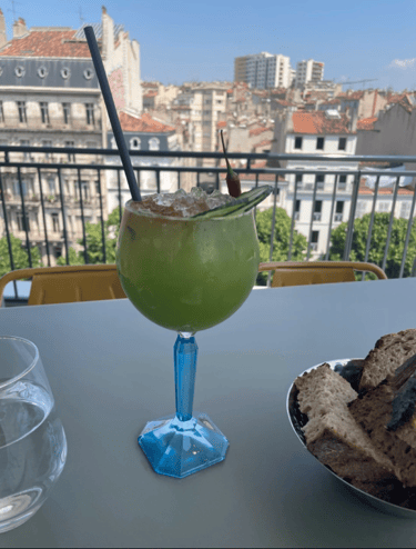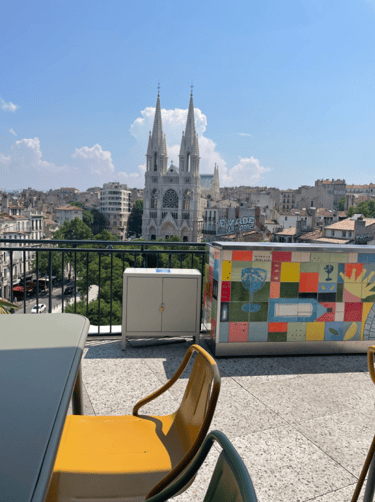 I arrived for lunch on a random Wednesday from the entrance on Gambetta and take the lift to the 4th floor. An eclectic space with art and vintage furniture greets me and at the end of the entry a large bright room with fierce views of the Eglise St. Vincent de Paul. Like Gail Halaban came to visit Marseille, you see directly into Marseille’s apartments and it’s mish mash skyline of architecture, from the last century artfully carved stone buildings and wrought iron balcony’s side by side to the functional 70s and sometimes brutalist design that is common in the city. I take a table on the terrace, that almost wraps around and I see later there are more seating options for times when you want to lounge around with a drink while you relax in the view.